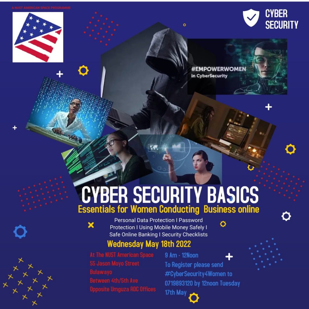 The NUST American Space will be conducting a training in Cyber Security Basics that will be unpacking the essentials for women conducting business online on Wednesday the 18th of May 2022. The workshop aims at equipping women in business with safe ways of conducting business online without compromising their privacy, personal safety and their security. Topics to be covered will include personal data protection, password protection, safe online banking, using mobile money safely and security checklists.